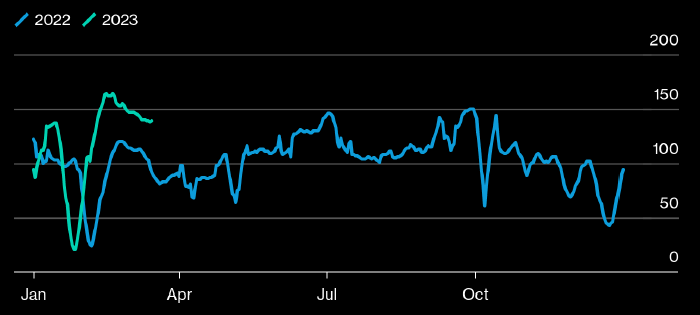 Низкий спрос на топливо в Азии хорошо объясняется слабой динамикой загруженности автодорог Китая. После быстрого роста в феврале дорожный трафик в стране постепенно снижается: на неделе до 22 марта его плотность в 15 крупнейших городах Китая снизилась на 3% н/н. Тем не менее данный показатель все еще остается на 35% выше уровней января 2021 года.