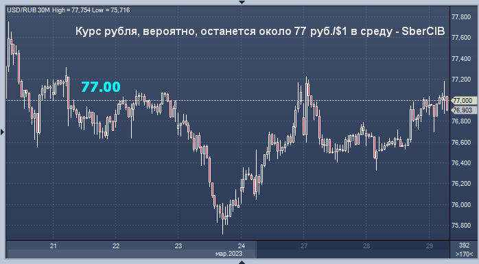 Курс рубля по отношению к доллару США, вероятно, останется около уровня 77 руб./$1 в течение торговой сессии в среду, пишут эксперты SberCIB Investment Research. Доходности ОФЗ могут продолжить расти в среду, если Минфин предоставит на аукционах более значительные премии, чем обычно, указывают в инвестбанке.