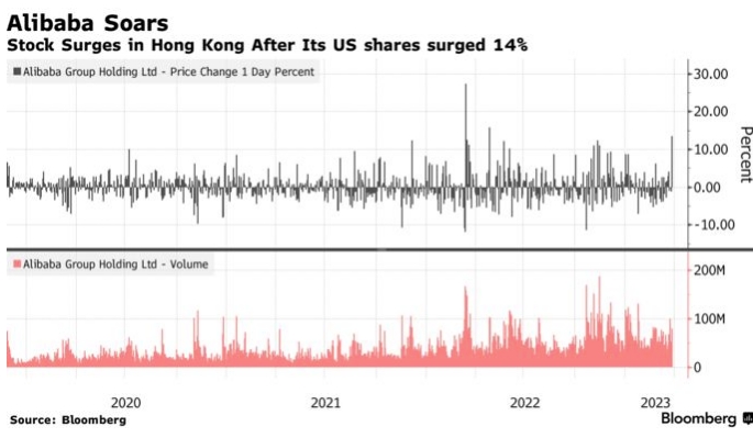 Инвесторы устремились обратно к акциям Alibaba и других крупных технологических компаний, которые пострадали от репрессий со стороны Пекина за последние два года. Акции Alibaba в Гонконге подскочили на 13%, отслеживая скачок котируемых в США АДР после того, как гигант электронной коммерции заявил, что разделится на шесть компаний в результате реструктуризации, которая обещает привести к нескольким первичным публичным предложениям.