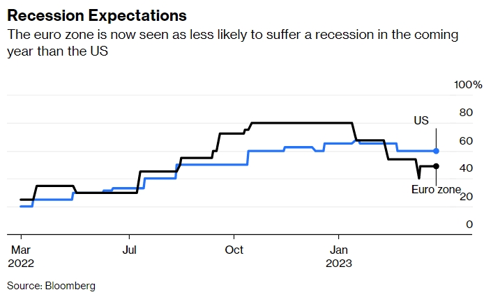 По данным экономистов, опрошенных Bloomberg, вероятность рецессии в еврозоне в этом году снизилась почти вдвое, до уровня ниже 50%. Сейчас это ниже, чем в США, где вероятность затяжного сокращения составляет 60%. Это заметное изменение ожиданий, поскольку еврозона находилась на грани рецессии до пандемии и больше всего пострадала от скачка цен на природный газ.