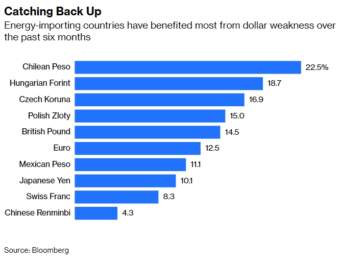 Страны-импортеры энергоносителей больше всего выиграли от слабости доллара за последние шесть месяцев. Источник: Блумберг.