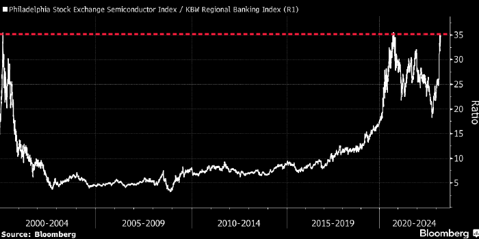 Неудивительно, что на этом фоне отношение индекса производителей полупроводников (Philadelphia Semiconductor Index, SOX) к индексу региональных банков (KBW Regional Bank Index) показало наиболее масштабный с 2001 года 10-дневный рост в 28%, вернувшись в область рекордных значений (см. график ниже).