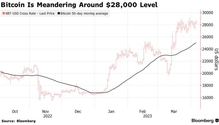 Биткойн колеблется около уровня 28 000 долларов. Блумберг
