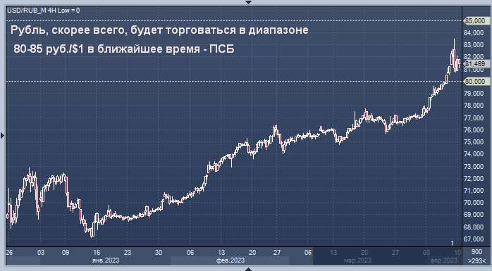 "Доллар вновь демонстрирует рост в понедельник утром. На данный момент прогнозировать динамику рубля затруднительно, ввиду чего мы устанавливаем широкий диапазон 80-85 руб./$1. С одной стороны, активные покупки валюты могут сохраниться и доллар вполне может перейти в верхнюю часть вышеуказанного коридора. С другой стороны, постепенная активизация экспортеров, а также техническая картина могут привести к паузе в росте доллара и его последующей коррекции перед налоговыми выплатами. Мы склонны полагать, что в перспективе нескольких недель часть роста будет компенсирована накопившейся валютной выручкой экспортеров, однако среднесрочно курс доллара может продолжить обновлять рекорды 2023 года", - отмечает аналитик.