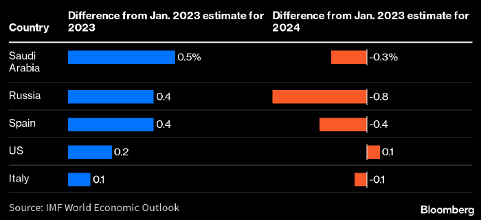 Изменения прогнозов МВФ по темпам роста ВВП некоторых стран мира в 2023 (синим) и 2024 (оранжевым) годах по сравнению с январскими оценками. Источник: Bloomberg