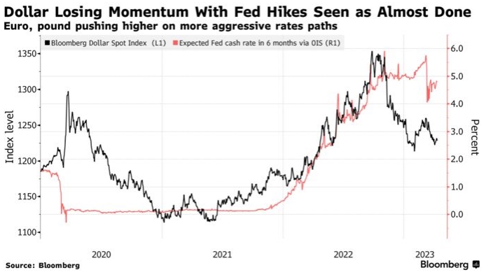 Индекс Bloomberg Dollar Spot упал почти на 10% с момента достижения рекордного максимума в сентябре, поскольку ФРС замедлила темпы повышения процентных ставок. Евро и британский фунт выросли за последний месяц, так как трейдеры ожидают, что центральные банки поднимут процентные ставки в ближайшие шесть месяцев, в то время как ФРС, вероятно, оставит ДКП без изменений, прежде чем снизит стоимость заимствований в конце этого года.
