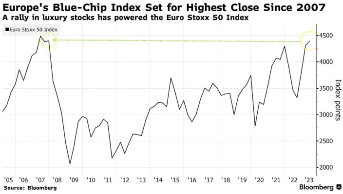 В то время как европейские акции выросли в этом году после спада в 2022 году из-за опасений по поводу инфляции, Euro Stoxx 50 потребовалось гораздо больше времени, чем его конкурентам, чтобы восстановить эти уровни, отчасти из-за его подверженности влиянию динамики акций банковскоого сектора, который несколько лет отставал от рынка на фоне отрицательных процентных ставок. Общеевропейский индекс Stoxx 600 достиг новых рекордных высот после мирового финансового кризиса, в то время как индекс голубых фишек в последний раз бил рекорд в 2000 году.