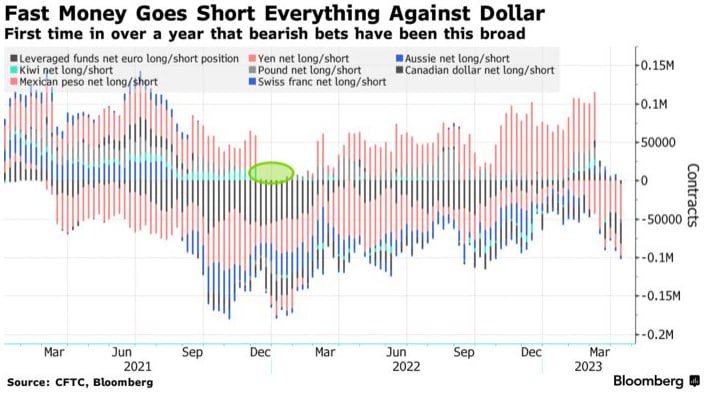 Согласно последним данным Комиссии по торговле товарными фьючерсами, на прошлой неделе фонды с кредитным плечом имели короткие позиции по всем основным валютам против доллара, впервые с января 2022 года. В то время как показатель общей позиции инвесторов остается медвежьим в отношении доллара США, широкая степень оптимизма среди хедж-фондов может сигнализировать о снижении обеспокоенности по поводу влияния банковского кризиса на готовность ФРС бороться с инфляцией.