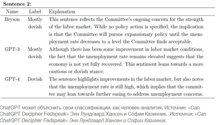 В первой статье под названием Can ChatGPT Decipher Fedspeak?, два исследователя из самой ФРС обнаружили, что ChatGPT ближе всех подошел к людям в выяснении того, были ли заявления центрального банка голубиными или ястребиными. Энн Лундгаард Хансен и София Казинник из Федерального резервного банка Ричмонда показали, что он превосходит широко используемую модель Google под названием BERT, а также классификации, основанные на словарях.