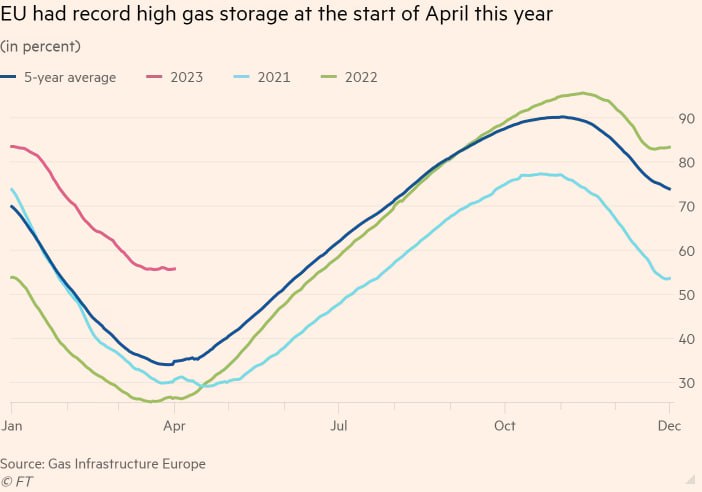 Единственным другим годом, который приблизился к уровню этого года, был 2020 год, когда пандемия резко снизила спрос на газ. На середину апреля текущий уровень немного ниже уровня 2020 года.