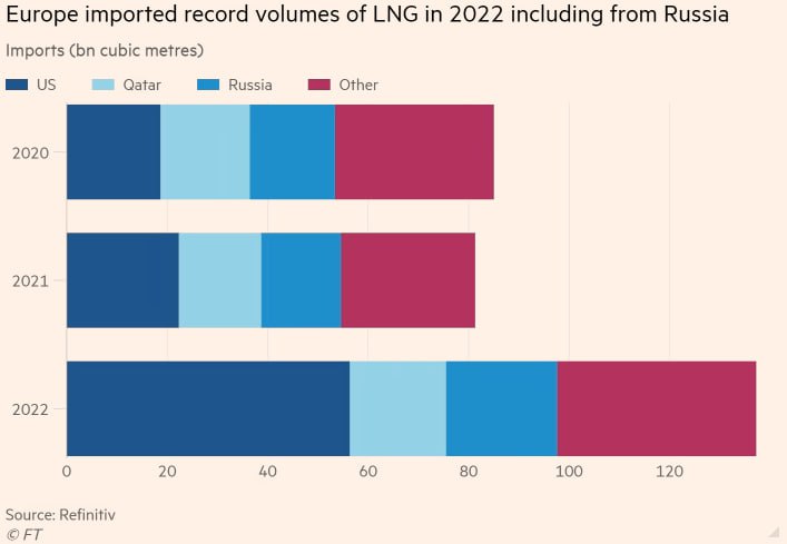 По данным Refinitiv, импорт СПГ в ЕС из России в прошлом году достиг 22,1 млрд куб.