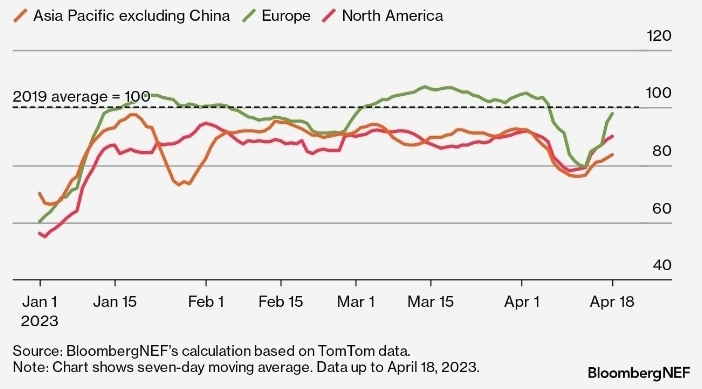 Уровни пробок в разных регионах проиндексированы по среднесуточному показателю за 2019 год. Диаграмма показывает семидневную скользящую среднюю. Данные на 18 апреля 2023 г.