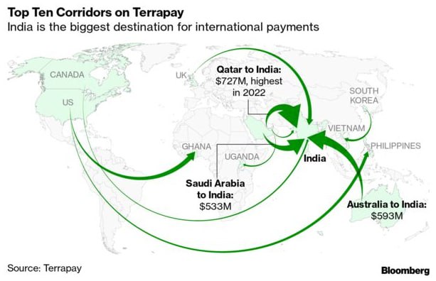 Цифры компании показывают, что Индия является крупнейшим получателем денег из-за рубежа. Как видно из графика, деньги текут из Катара, Саудовской Аравии, Австралии и США. Это перекликается с оценками Всемирного банка, а также с данными ООН, которые показывают, что 18 миллионов индийцев живут за пределами страны своего рождения — самая большая диаспора в мире.