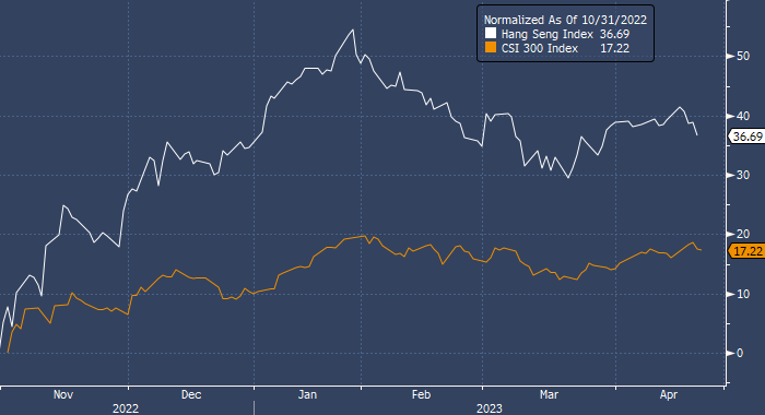 В пятницу, 21 апреля, нерезиденты продали акции китайских компании в Шанхае и Шэньчжэне на чистые CNY7,6 млрд ($1,1 млрд), что оказалось рекордным значением с 31 октября. Интересно, что 31 октября стало последним днем затяжного снижения фондовых индексов Hang Seng и CSI 300 перед мощным ростом в следующие три месяца на 55% (в первом случае) и на 20% (во втором), поводом для которого послужило снятие антиковидных ограничений в Китае и открытие страны.