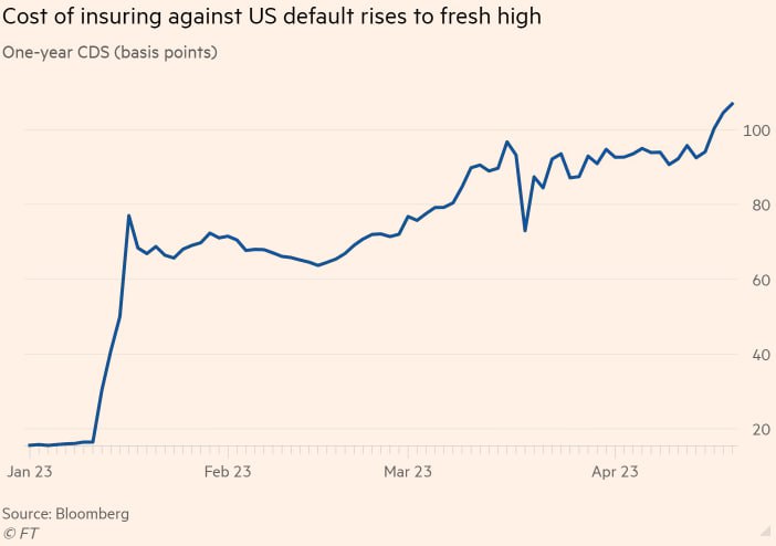 Это самый высокий уровень, по крайней мере, с 2008 года, по сравнению с 15 базисными пунктами в начале года, и намного превышающий уровень 2011 года, когда противостояние в Вашингтоне по поводу потолка долга США привело к тому, что страна потеряла свой наивысший кредитный рейтинг. Переговоры этого года в Вашингтоне по поводу повышения лимита федеральных заимствований в настоящее время зашли в тупик.