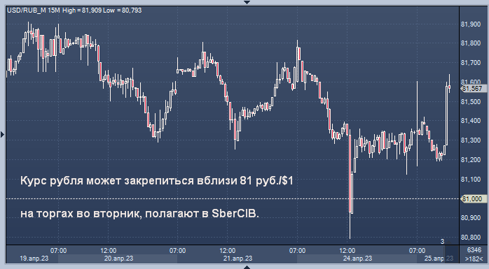 Курс рубля может закрепиться вблизи 81 руб./$1 на торгах во вторник, полагают в SberCIB.