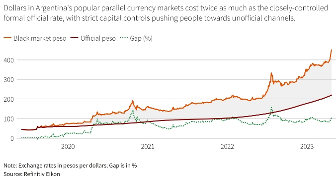 В понедельник песо достиг рекордно низкого уровня в 460 за доллар на черном рынке. Этот рынок стал основным для аргентинцев, поскольку официальный валютный рынок находится под жестким контролем властей. 400 песо за доллар давали всего неделю назад. Для сравнения, официальный курс составляет 220.