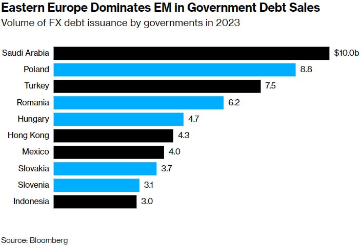 Восточная Европа доминирует над развивающимися рынками по продажам государственных долговых обязательств. Объем выпуска государственных долговых обязательств в иностранной валюте в 2023 г. Источник: Блумберг.
