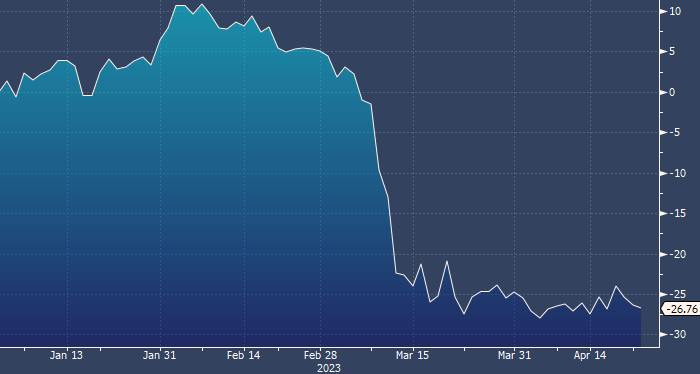 Процентная динамика индекса американских региональных банков S&P Regional Banks Select Industry Index с начала года интервалами 1 день