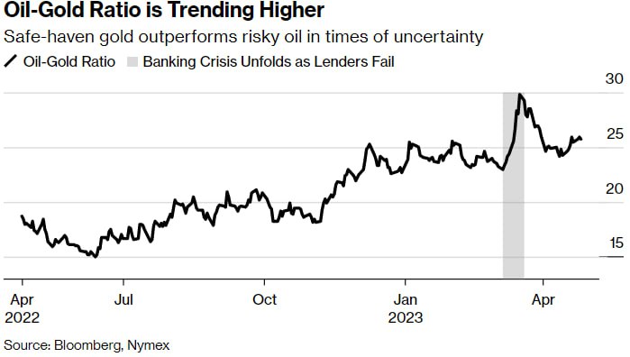 Соотношение нефти и золота — спотовая цена слитка, деленная на фьючерсы на нефть West Texas Intermediate, — является барометром состояния мировой экономики, причем более высокие значения указывают на то, что инвесторы готовятся к рецессии. Соотношение росло с середины 2022 года и резко возросло в конце марта, поскольку банковский кризис повысил привлекательность золота как убежища.
