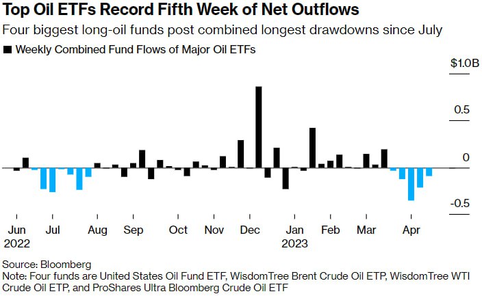 Крупнейшие нефтяные ETF фиксируют чистый отток капитала пятую неделю подряд. Четыре крупнейших долгосрочных нефтяных фонда в совокупности зафиксировали самую продолжительную просадку с июля. Источник: Блумберг. Примечание: Четыре фонда - это United States Oil Fund ETF, WisdomTree Brent Crude Oil ETP, WisdomTree WTI Crude Oil ETP и ProShares Ultra Bloomberg Crude Oil ETF