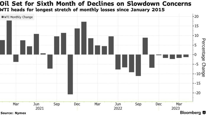 Сырая нефть в апреле резко подорожала после того, как Организация стран-экспортеров нефти и ее союзники объявили о сокращении добычи, но затем потеряла все эти достижения, поскольку перспективы спроса ухудшились. Поставки из России оставались на удивление устойчивыми, несмотря на санкции и ограничение цен, а восстановление Китая было медленнее, чем некоторые ожидали.