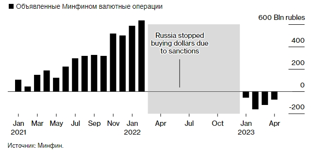Покупки валюты в ФНБ были остановлены в конце января 2022 года, а затем программа была приостановлена в феврале. Министерство финансов в этом году продавало иностранную валюту только в рамках обновленного бюджетного механизма, предназначенного для защиты экономики от волатильности товарных рынков. Россия получает около трети доходов своего бюджета от нефтегазовой отрасли.