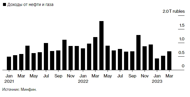 В первом квартале отчисления от нефти и газа в российский бюджет сократились на 45% по сравнению с прошлым годом до 1,64 трлн рублей. Дефицит бюджета на конец апреля уже намного превышает годовой целевой показатель Министерства финансов на 2023 год.