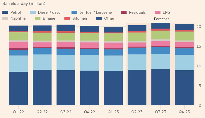Согласно правительственным данным, обработанным S&P Global Commodity Insights, спрос на дистилляты, включая дизель, используемый для грузовиков и поездов, которые перевозят товары по стране, в первом квартале 2023 года оказался примерно на 6% ниже по сравнению с аналогичным периодом прошлого года из-за замедления торговли.