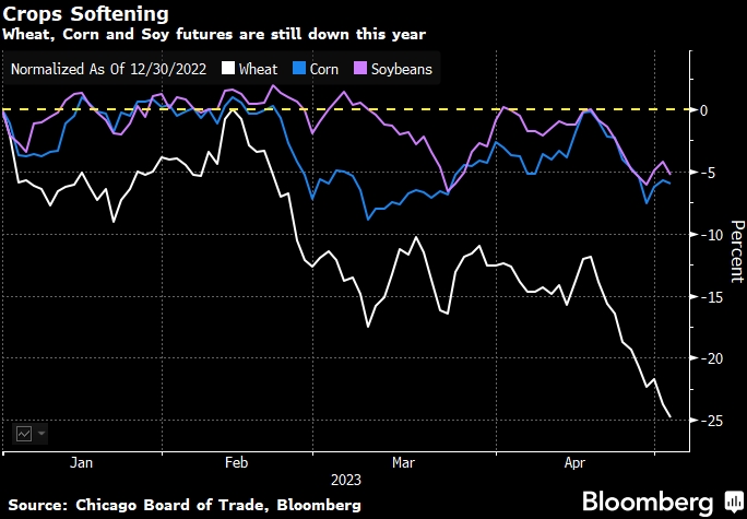 Фьючерсы на пшеницу в Чикаго колебались вокруг самого низкого уровня с июля 2021 года. Падение пока приостановилось, поскольку низкие цены привлекли больше покупателей. Однако мировые запасы растут, а благоприятная погода в США улучшают перспективы предложения зерна и ухудшают перспективы цен на него. Цены на пшеницу Европейского Союза также снижаются, поскольку блок по-прежнему обременен ростом запасов перед урожаем этого года.