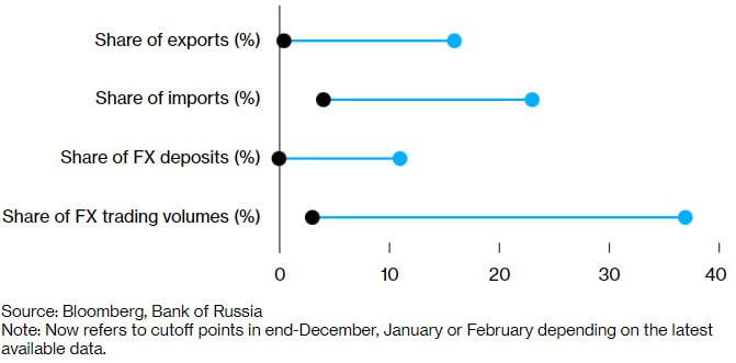 Распространенность юаня (черный - до СВО, голубой - после). Китайская валюта вторглась во все сферы финансовой жизни России. Источник: Bloomberg, Банк России. Примечание. Теперь речь идет о точках отсечения в конце декабря, январе или феврале в зависимости от последних доступных данных.