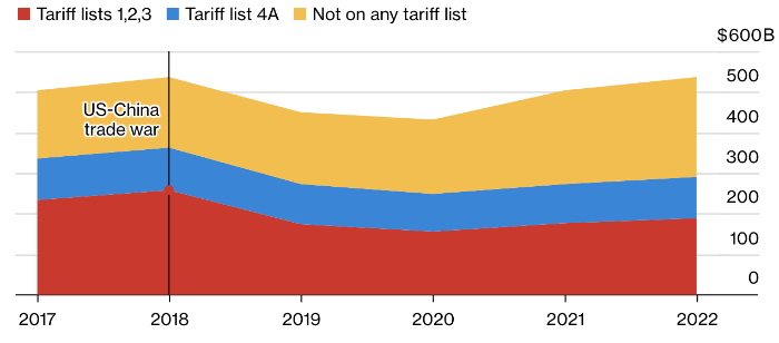 Рост геополитической напряженности в отношениях между Вашингтоном и Пекином подогрел разговоры о секторальном разрыве между крупнейшими экономиками мира. В 2022 году стоимость импорта китайских товаров и услуг в США достигла рекордного уровня, однако тарифы США уже влияют на двусторонние торговые потоки. В прошлом году импорт американских товаров из Китая, на которые распространяются тарифы, сократился примерно на 14% по сравнению с уровнем 2017 года, то есть до начала торговой войны. На это указывают результаты анализа Чада Бауна, старшего научного сотрудника Института международной экономики Петерсона.