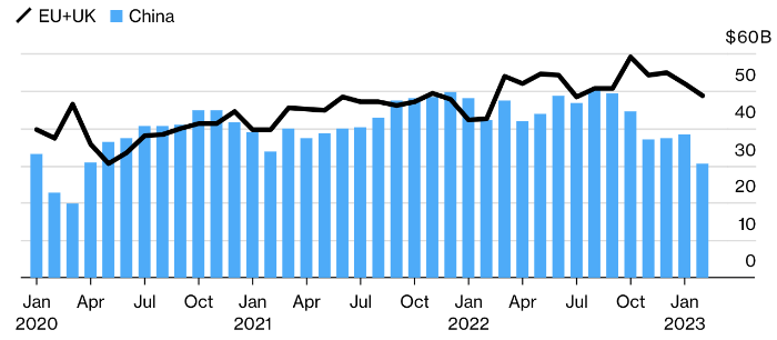 Усилия президента Джо Байдена по улучшению торговых отношений с Европой привели к тому, что США стали больше полагаться на импорт из Европы, чем из Китая. Поворот произошел после того, как США и Европа отменили пошлины на двустороннюю торговлю стоимостью $21,5 млрд в 2021 году, приостановили спор о производстве самолетов, начавшийся в 2004 году, и начали переговоры о сокращении перепроизводства стали и алюминия. За последний год стоимость импорта США из Европы выросла почти на 13%, в то время как импорт США из Китая вырос всего на 6%.