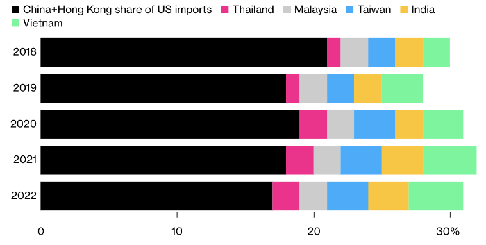 За последние пять лет тарифы, экспортные ограничения и субсидии США убедили американские компании диверсифицировать свой импорт и частично отказаться от продукции Китая. С 2018 года, то есть с тех пор, как бывший президент Дональд Трамп ввел тарифы на тысячи китайских товаров, общая доля китайского импорта в США снизилась примерно на 3%. За это время Китай уступил часть своей доли в общем объеме импорта США другим азиатским странам-экспортерам, таким как Вьетнам, Индия, Тайвань, Малайзия и Таиланд.
