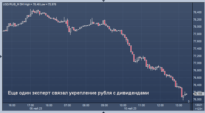 Евро, доллар США и юань возобновили резкое падение после возвращение трейдеров с длинных майских праздников. Ранее аналитики нескольких компаний отмечали, что рубль укрепляется вследствие продажи российскими экспортерами валютной выручки в рамках подготовки к выплате дивидендов. Сегодня мы снова слышим это мнение.