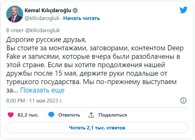 «Русские друзья, вы стоите за заговорами, контентом Deep Fake и записями, которые были обнародованы вчера в этой стране», — заявил в четверг Кемаль Киличдароглу в сообщении на русском и турецком языках в Twitter. «Если вы хотите, чтобы наша дружба продолжалась после 15 мая, уберите руки от турецкого государства».
