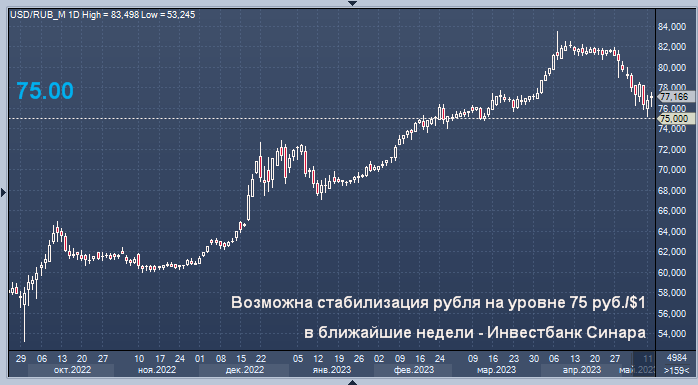 Полагаем, во 2П23 будут преобладать фундаментальные факторы для укрепления рубля, и ожидаем стабилизации курса в ближайшие недели на уровне 75 руб./$1", - пишет эксперт.