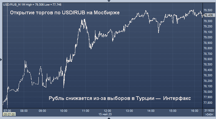 В частности, эксперты "Интерфакс-ЦЭА" пишут сегодня, что "рубль заметно дешевеет днем в понедельник в основных валютных парах, корректируясь вниз после сильного роста, наблюдавшегося с последних дней апреля. Давление на рубль оказывает неопределенность относительно президентских выборов в Турции, которые прошли в воскресенье, 14 мая. По данным местных СМИ, нынешний президент Реджеп Тайип Эрдоган набирает 49,36%, его главный соперник Кемаль Кылычдароглу - 44,99% по итогам подсчетов свыше 99% бюллетеней. Таким образом выборы не выявили победителя в первом туре. Второй тур состоится 28 мая".