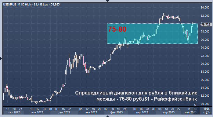 С учетом повышенной неопределенности, вызванной временными факторами, мы оцениваем справедливый диапазон для рубля в ближайшие месяцы достаточно широким - 75-80 руб./$1", - пишут экономисты банка.