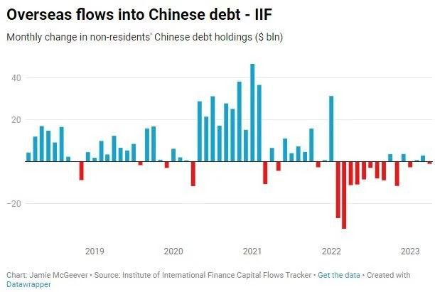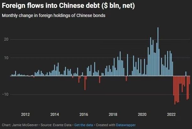 Данные за март этого года, собранные исследовательской фирмой Exante Data по макроэкономическим данным, показывают, что иностранцы активно продавали китайские облигации каждый месяц, с тех пор как Россия начала СВО на Украине.