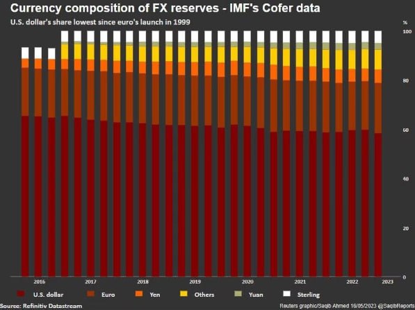 Номинальная доля доллара в мировых резервах составляет 58,35%, согласно валютной структуре официальных валютных резервов Международного валютного фонда, или данным Cofer, что является самым низким показателем с момента введения евро в 1999 году.