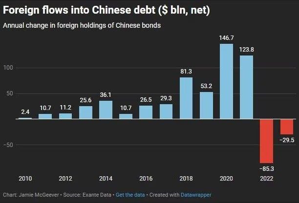 Данные Exante Data показывают, что иностранные инвесторы купили китайских облигаций на сумму 558 миллиардов долларов в период с 2010 по 2021 год. С февраля прошлого года по март этого они продали их на 115 миллиардов долларов.