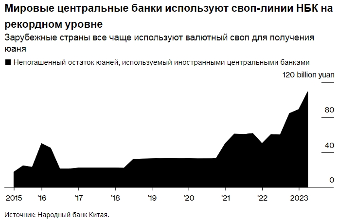 Согласно данным, опубликованным Народным банком Китая в понедельник, непогашенный остаток по всем свопам в иностранной валюте на конец марта составлял 109 млрд юаней (15,6 млрд долларов). Это на 20 млрд юаней больше, чем в конце 2022 года, что является вторым по величине квартальным скачком за всю историю наблюдений. PBOC не конкретизировал, какие именно страны использовали опцию своп-линий.