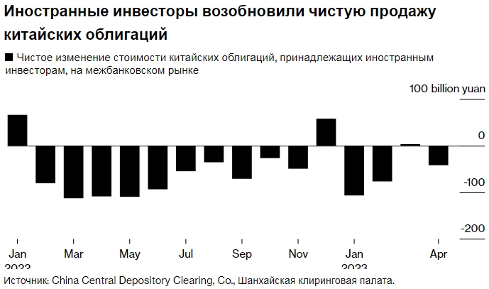 Согласно расчетам Bloomberg, основанным на данных, опубликованных Центральным депозитарием и клиринговой компанией Китая и Шанхайской клиринговой палатой, в прошлом месяце они сократили инвестиции в китайские облигации на межбанковском рынке на 41,7 млрд юаней (6 млрд долларов США). Только по суверенным облигациям иностранные позиции сократились на 171 млрд юаней за первые четыре месяца года.