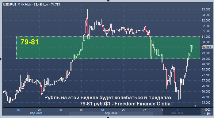 Эксперт прогнозирует рейндж на этой неделе 79-81 руб./$1, а уже в течение следующей ждет небольшое укрепление рубля на фоне начала налогового периода в России и приближения пика налоговых выплат 28 мая. Вероятно, на этом фоне курс доллара вновь опустится ниже 80 руб./$1.
