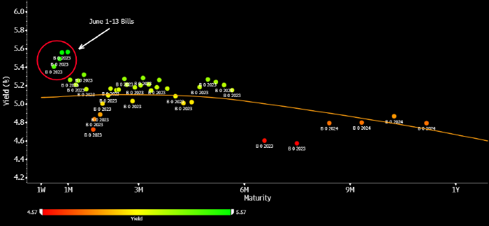 По состоянию на 12 мая запас наличных у федерального правительства США составлял $143 млрд, и этих средств должно оказаться достаточно для продолжения выплат кредиторам вплоть до 5 июня, пишет стратег Bloomberg Айра Джерси. Соответственно, по его словам, краткосрочные трежерис, погашающиеся 6 и (тем более) 8 июня, уже находятся в зоне серьезного риска.