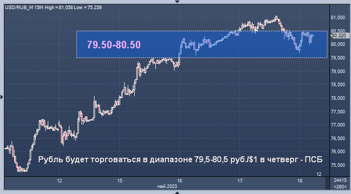 Пара доллар/рубль, скорее всего, будет проторговывать диапазон 79,5-80,5 руб./$1 в четверг ввиду отсутствия значимых драйверов к формированию направленной динамики, считает главный аналитик отдела экономического и отраслевого анализа Промсвязьбанка (ПСБ) Егора Жильникова.
