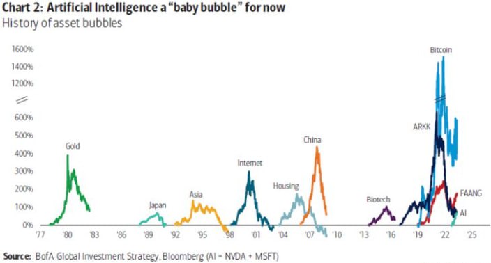 BofA заявил, что ИИ на данный момент является «детским пузырем», отметив, что в прошлом пузыри всегда начинались с «легких денег» и заканчивались повышением ставок. Они сослались на урок 1999 года, когда ралли интернет-акций и сильные экономические данные заставили ФРС возобновить ужесточение денежно-кредитной политики, а пузырь в акциях технологических компаний лопнул девять месяцев спустя.