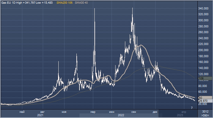 Если судить по стоимости ближнего фьючерса на индекс TTF, то газ в Европе на этой неделе (18 мая) впервые с июня 2021 г. опускался в цене ниже 30 евро за мегаватт-час. Это 23-месячный минимум. Цены снижаются седьмую неделю подряд — это самая длинная серия за 6 лет. Снижение цен обусловлено стабильными объемами предложения, мягкими погодными условиями и стабильным производством энергии со стороны возобновляемых источников (солнце, ветер).