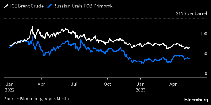 Цена нефти Brent (белым) и Urals (голубым) в долларах за баррель. Источник: Bloomberg